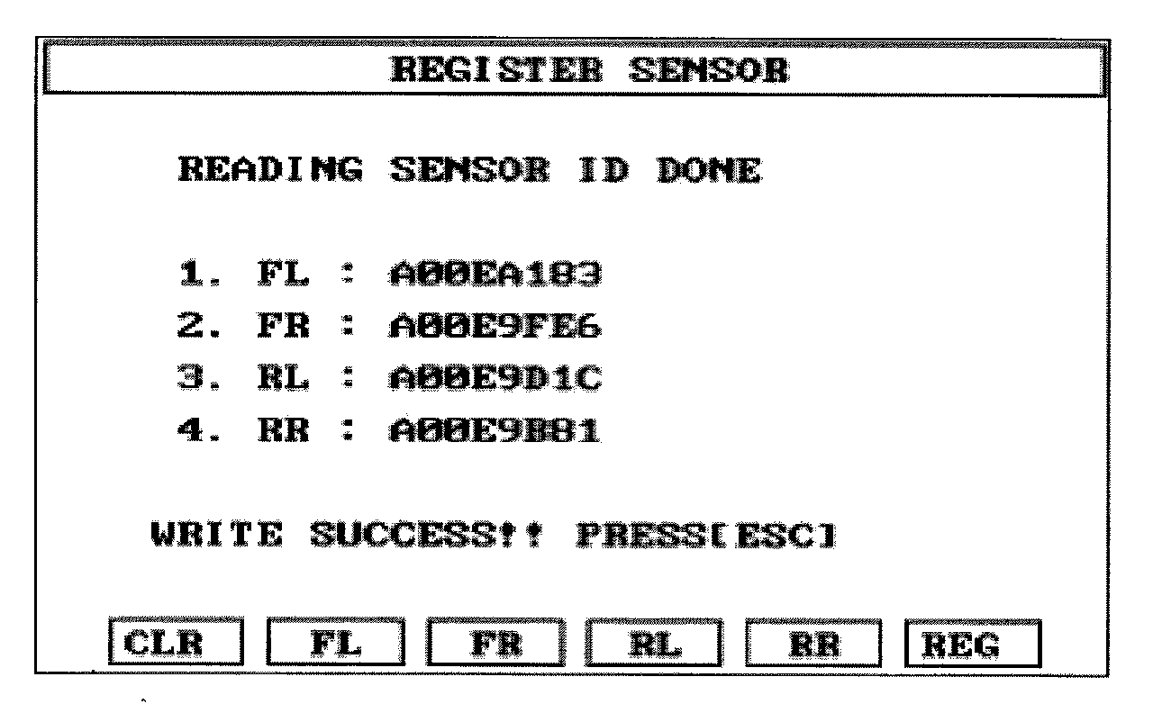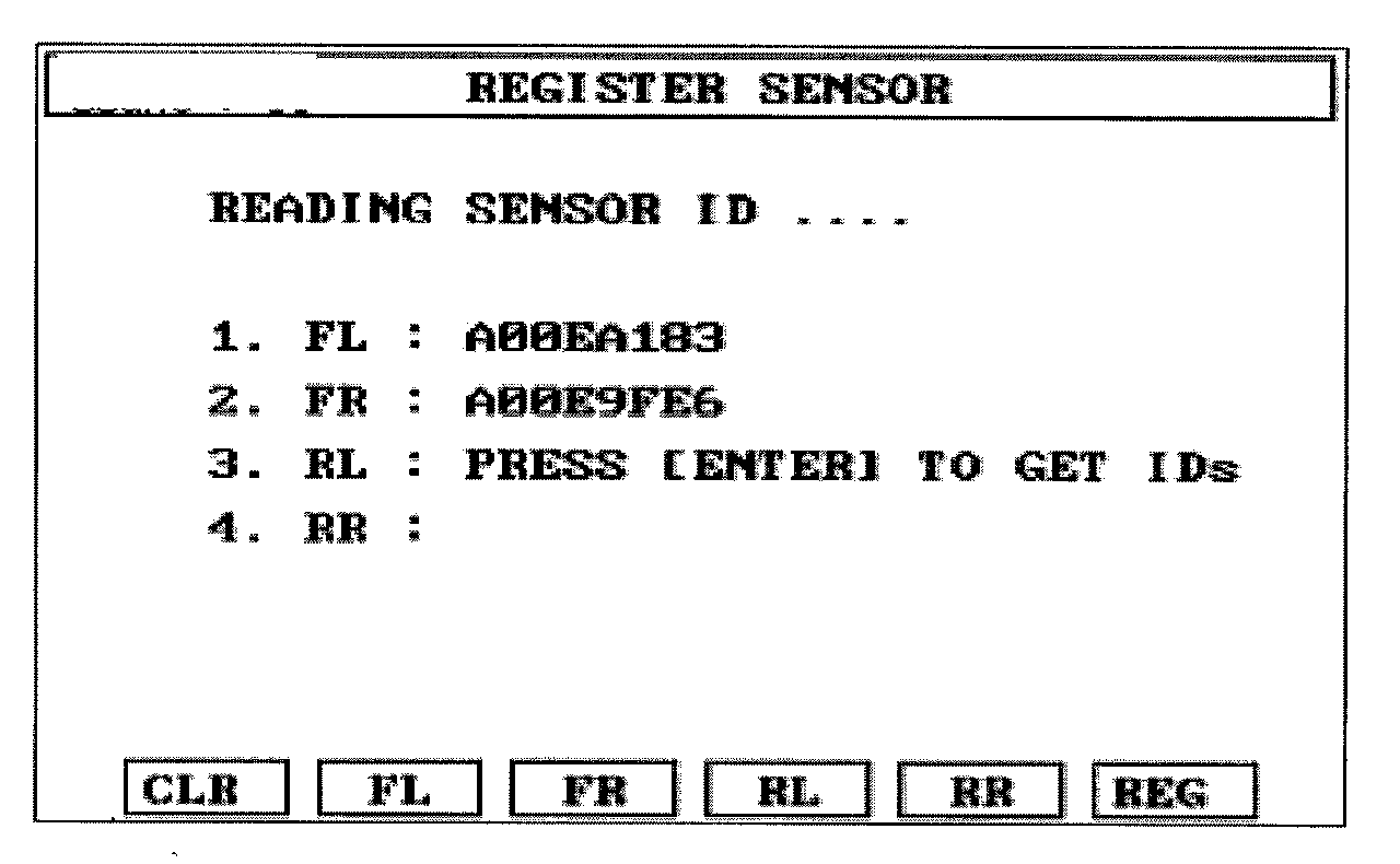 2. Read the four sensor's ids starting with sensor 1(1 normally front left, 2 front right, 3 rear left, 4 rear right).
