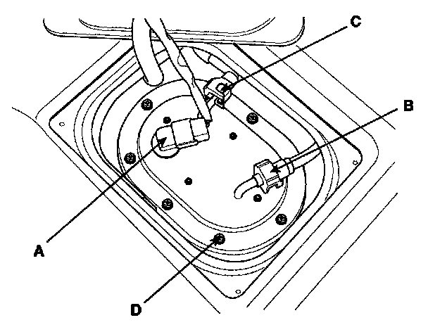 5. Remove the fuel feed hose (B) and suction hose (C).