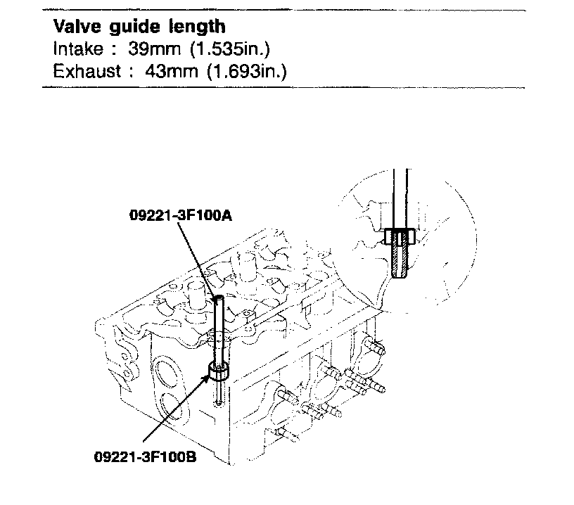 3. Using the SST (09221-3F100A/B), press-fit the valve guide. The valve guide must be press-fitted from the upper side of the cylinder head. Keep in mind that the intake and exhaust valve guides are different in length.