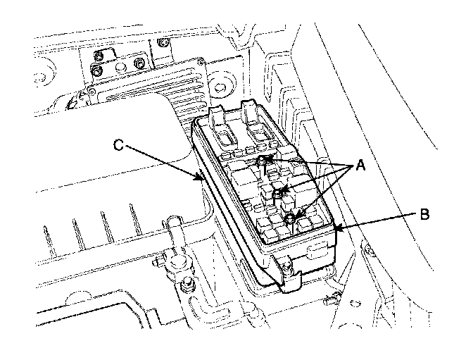 4. Remove the IPM (B) from the splash shield (C) after loosening the 3 IPM mounting bolts (A) and the IPM mounting clip.