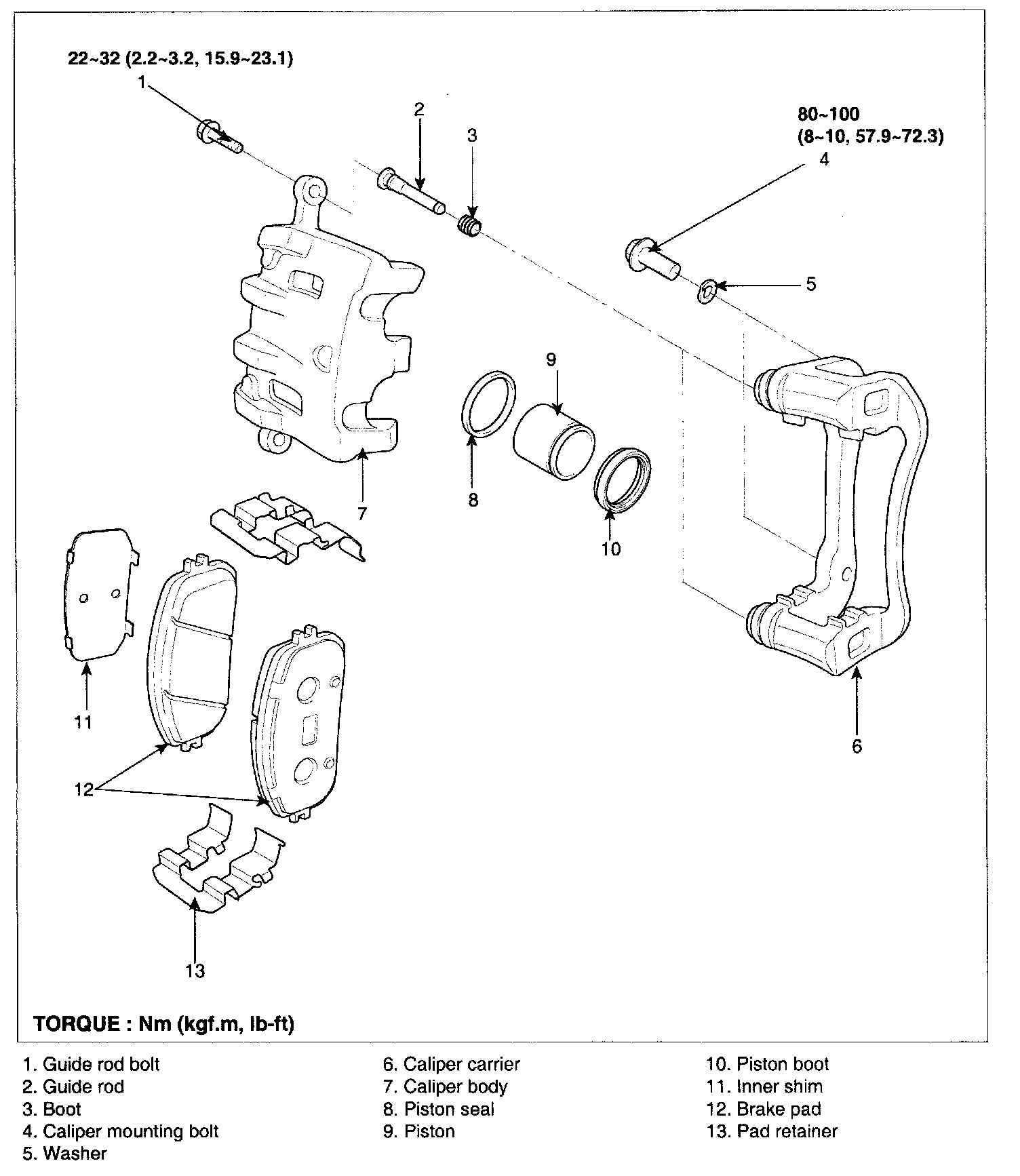 5. Being careful not to damage the pin boot, install the guide rod bolt (B) with the specified torque.