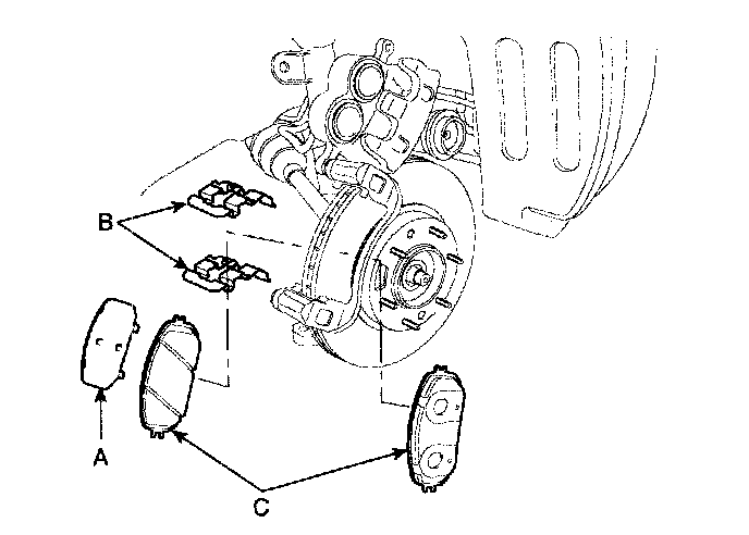 3. Remove pad shim (A), pad retainer (B) and pad assembly (C) in the caliper carrier.