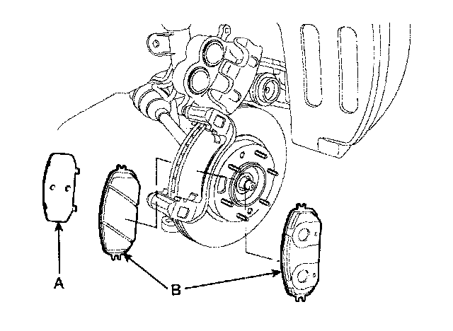 2. Install pad shims (A) and the brake pads (B) with the wear indicator on the inside.