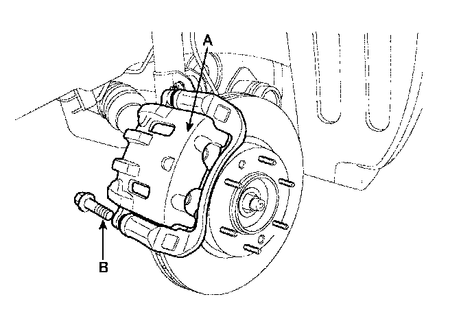 2. Remove the guide rod bolt (B), After raise the caliper assembly (A), support it with a wire.