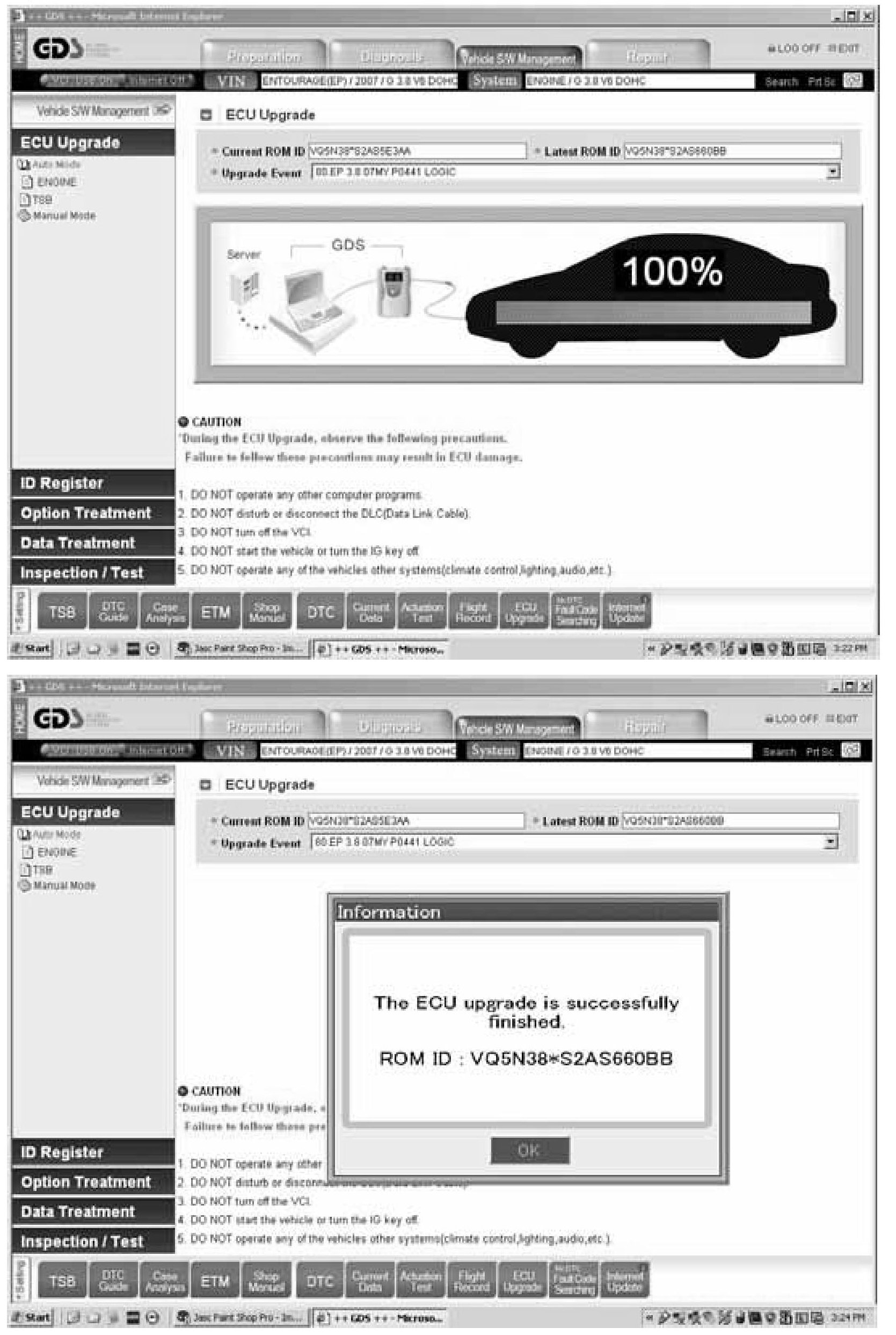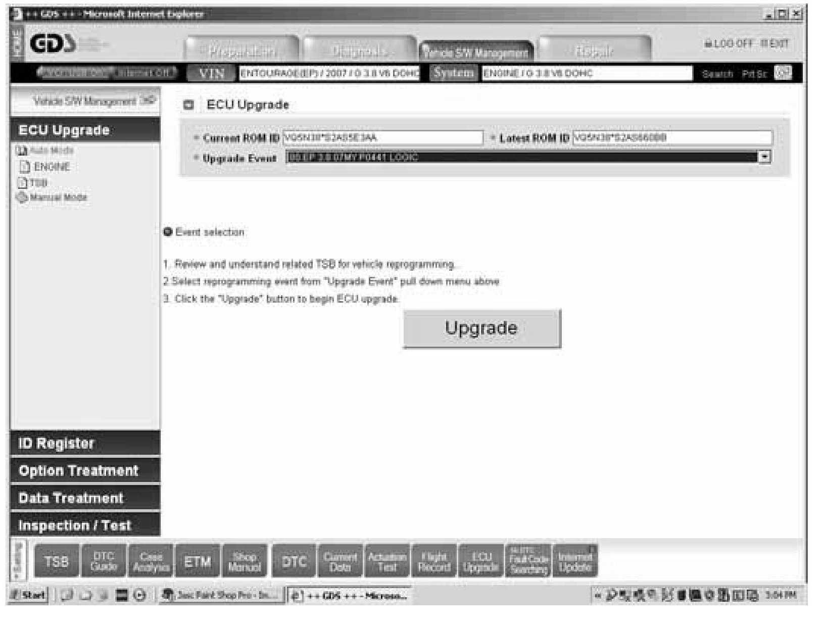 10. Select Upgrade Event: 80 EP 3.8 07MY P0441 LOGIC and then press the UPGRADE button as shown in the screen below: