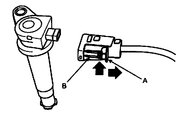 NOTE: When removing the ignition coil connector, pull the lock pin (A) and push the clip (B).