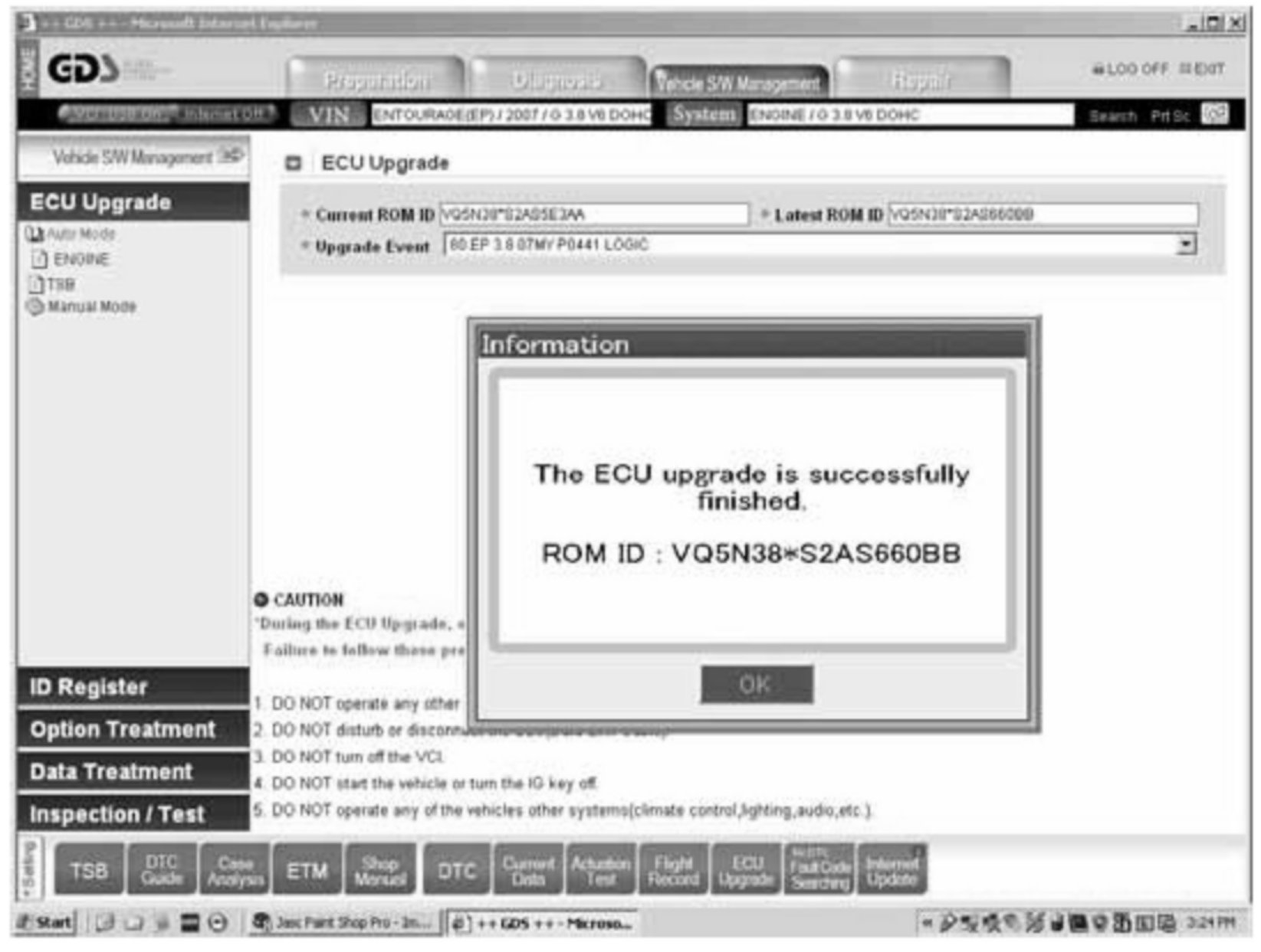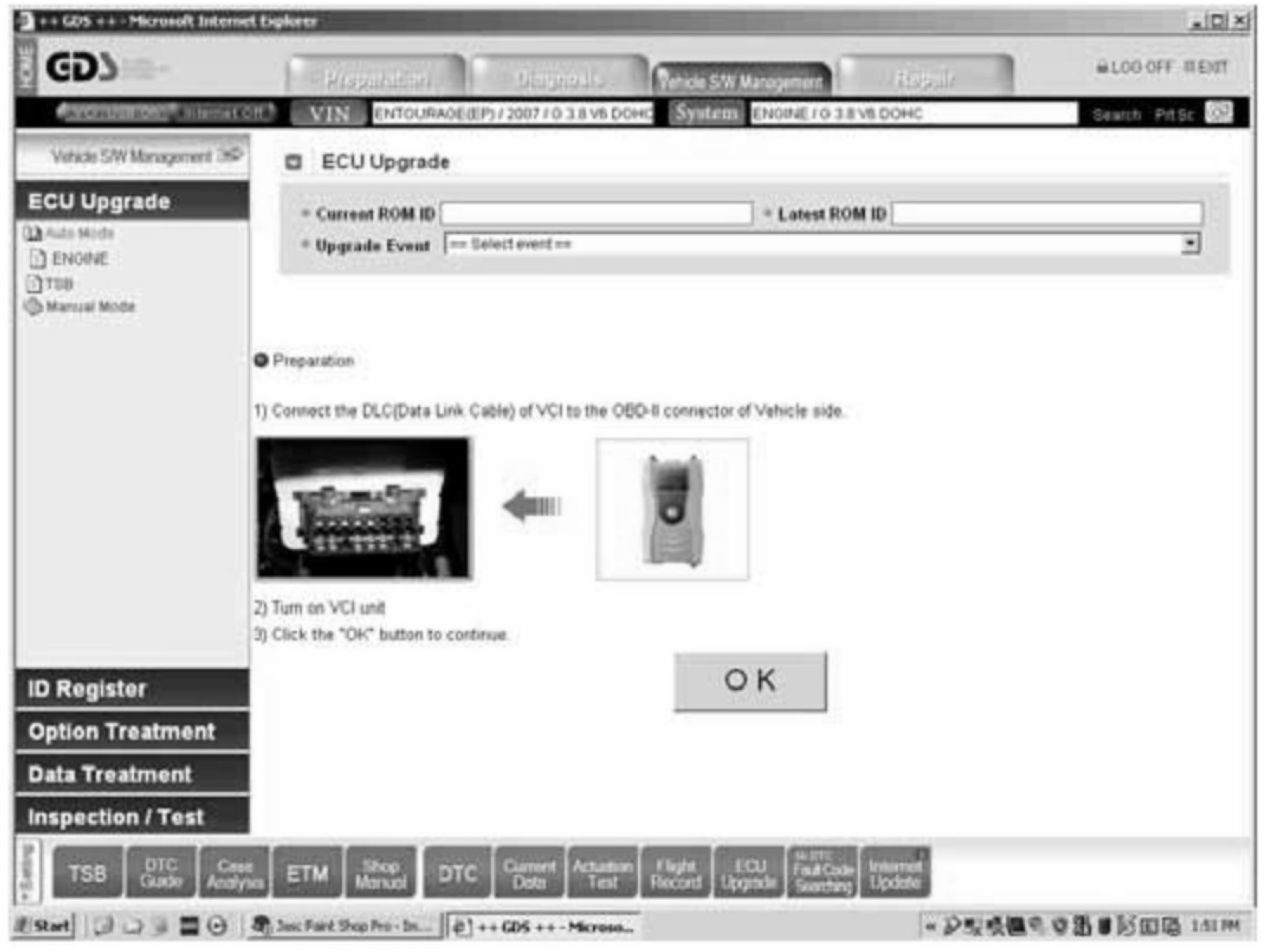 7. In the left column of the following ECU Upgrade screen select Auto Mode followed by ENGINE, then the OK button: