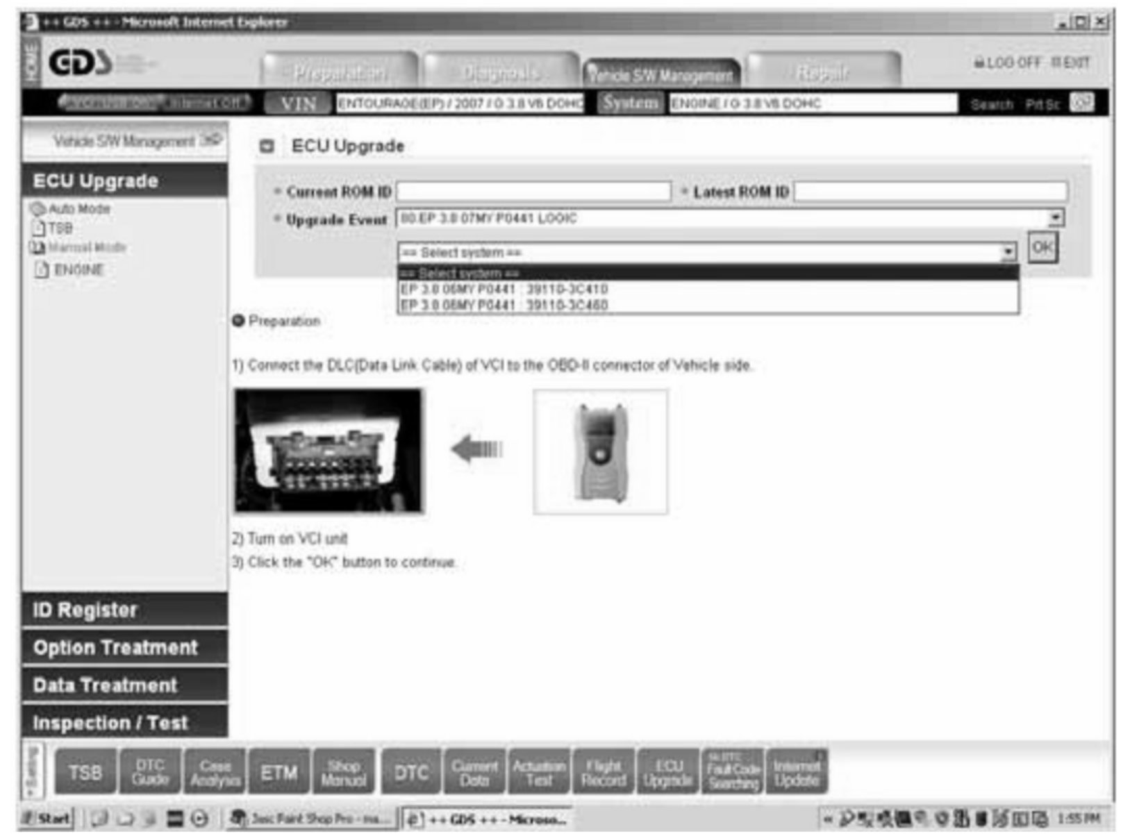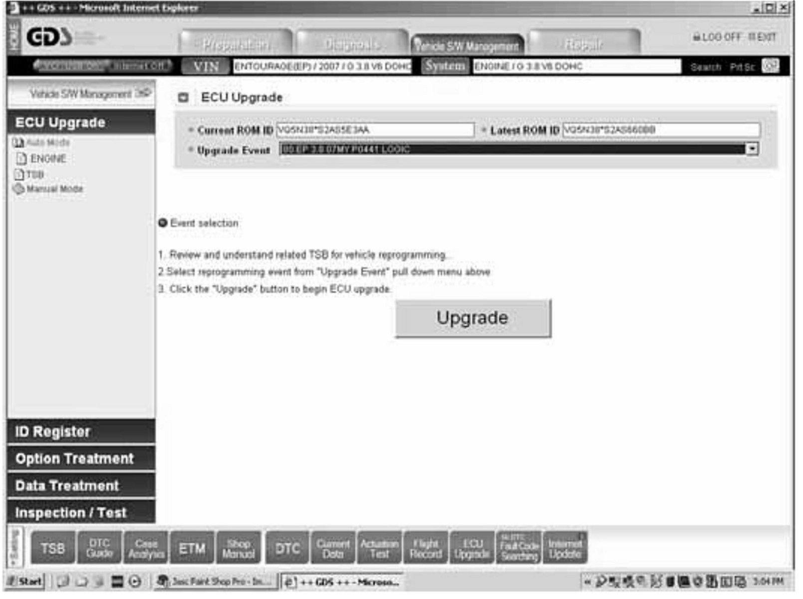10. Select Upgrade Event: 80 EP 3.8 07MY P0441 LOGIC and then press the UPGRADE button as shown in the screen shown.