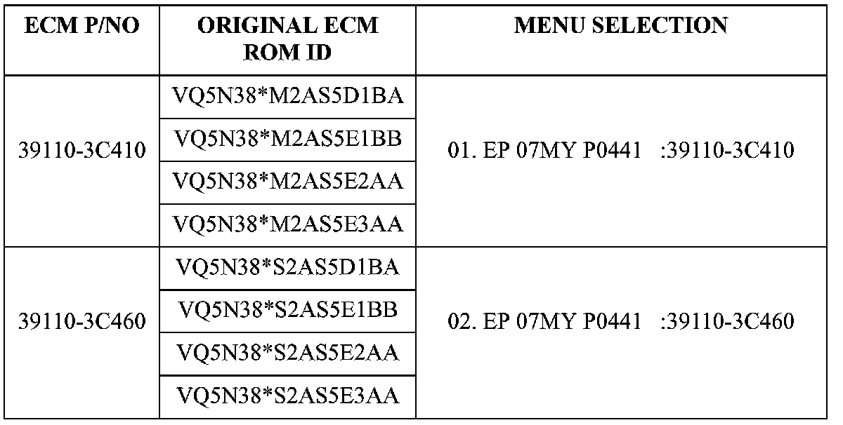 2. Within the ECU Upgrade screen in the left column select Manual Mode followed by ENGINE. Then select Upgrade Event: 80 EP 3.8 07MY P0441 LOGIC followed by the EGM part number from the table shown based on the original ROM ID information.