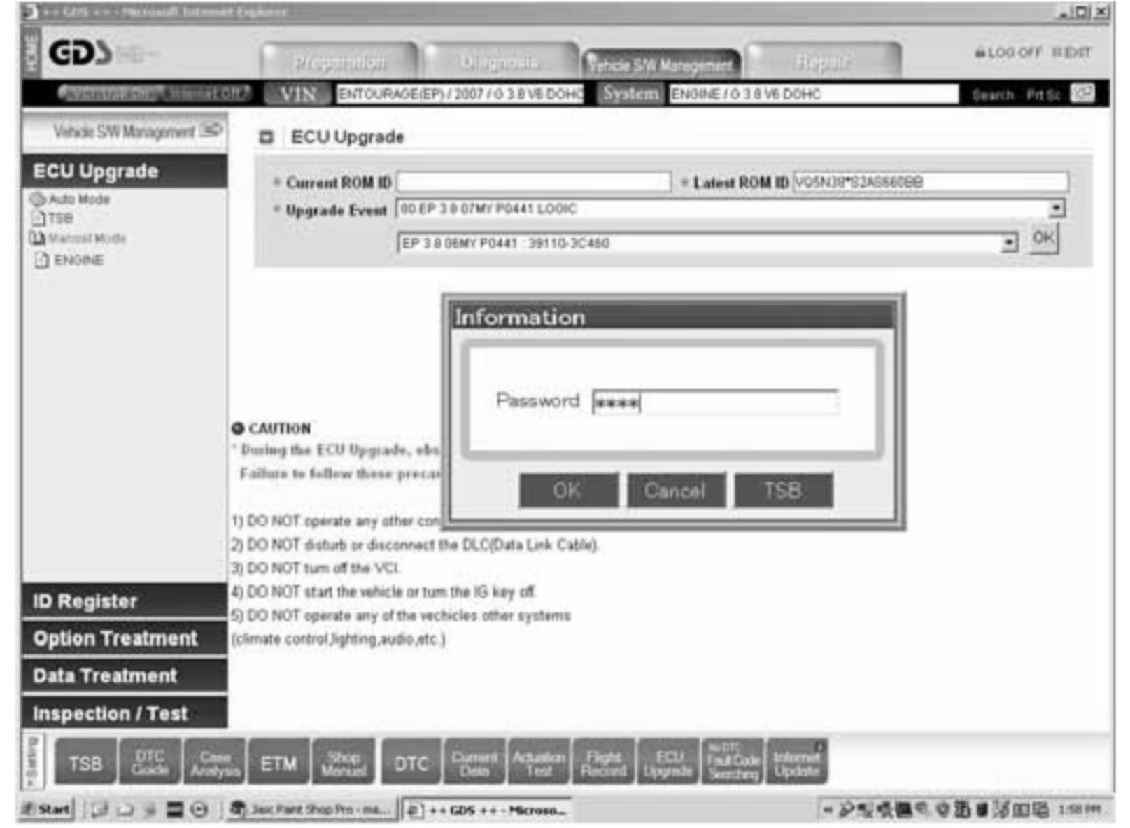3. Next enter the appropriate password from the table shown and select OK in the ECU Upgrade screen shown.