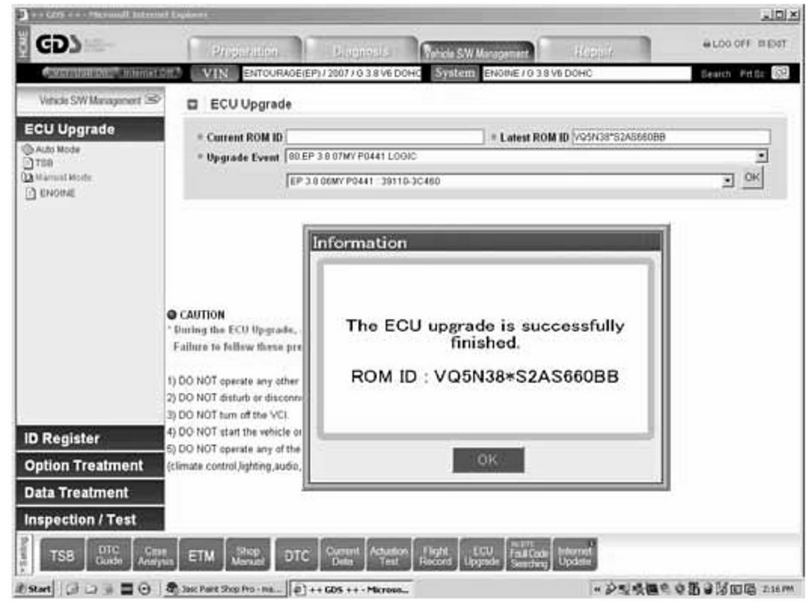 5. Follow any pop-up screen instructions that appear during reprogramming. Reprogramming has been completed successfully when the confirmation pop-up screen appears as shown.