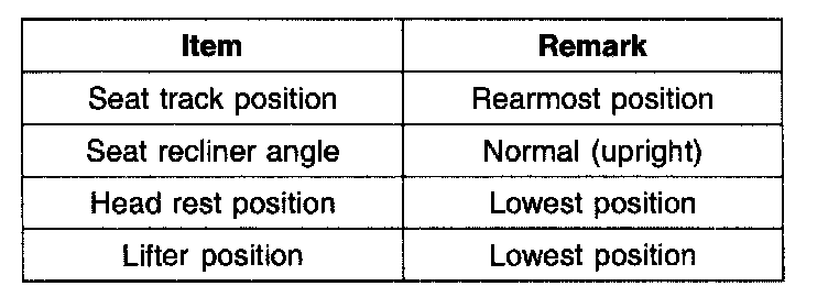 - When the measured weight deviates from the standard value, check again all the fastening bolts are tightened properly and make sure there is no interference. During the tightening, be careful not to deform the seat rail or seat structure. If the accuracy check is still not inside the standard value, replace the seat leg assembly.