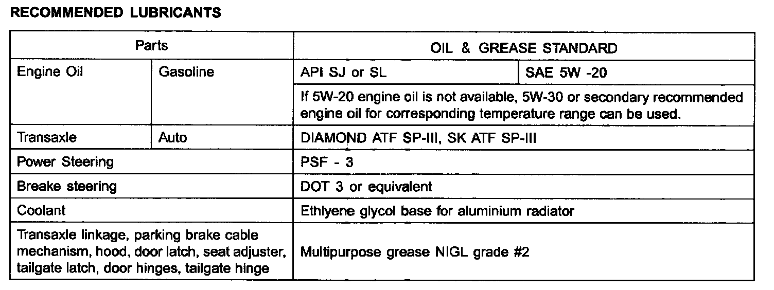 Using any other type of parts and fluid can cause serious damaged if the vehicle. RECOMMENDED LUBRICANTS