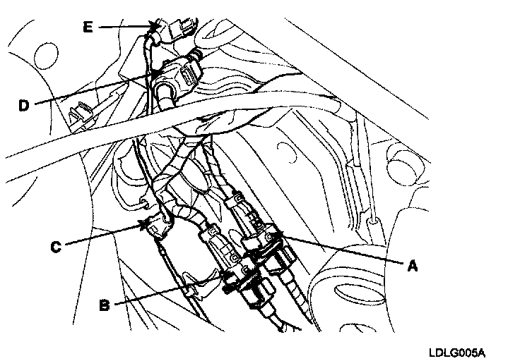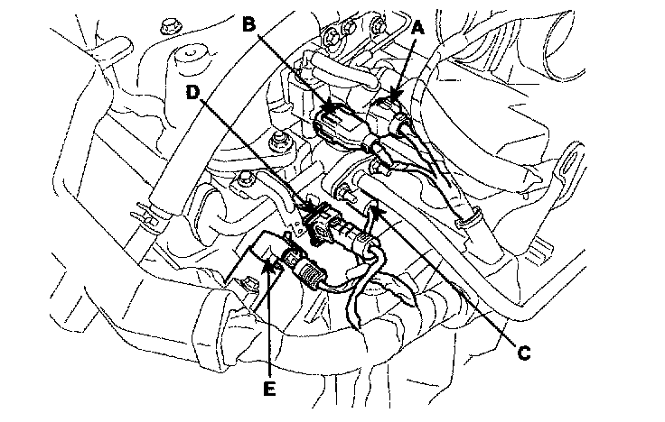 1) Disconnect the No.1/No.2 knock sensor connectors(A,B), the oil pressure switch connector(C), the ignition coil harness(D) and the No.1 VIS(Variable Induction System) connector(E).