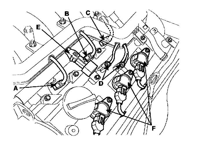 3) Disconnect the injection connectors(A,B,C), the ground lines(D), the condenser connector(E) and the Ignition coil connectors(F).