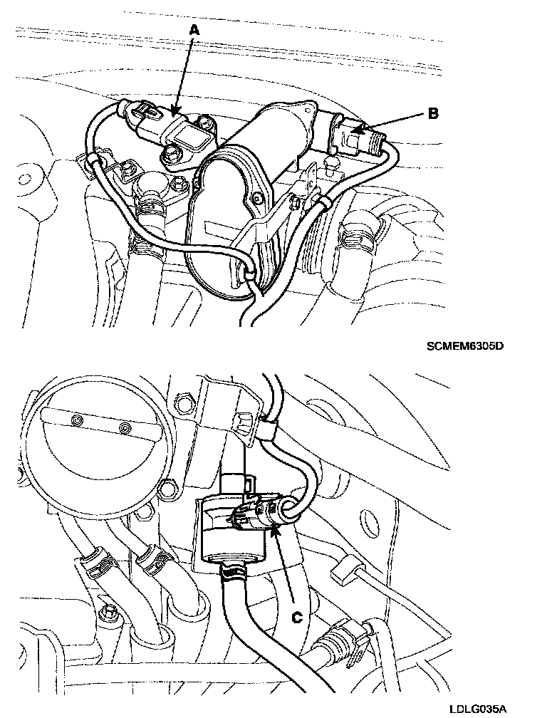 5) Disconnect the MAP(Manifold Absolute Pressure Sensor) connector(A), the ETC(Electronic Throttle Control) connector(B) and the PCSV(Purge Control Solenoid Valve) connector(C).