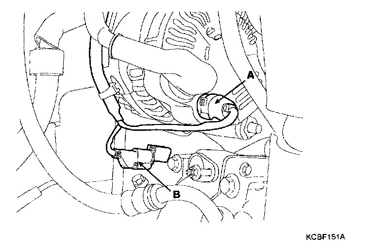 6) Disconnect the generator connector(A) and the air conditioning compressor connector(B).