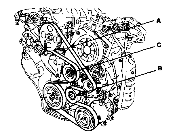 4. Remove the drive belt(A), the idler(B) and the tensioner(C).