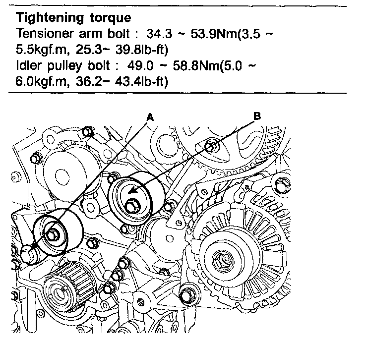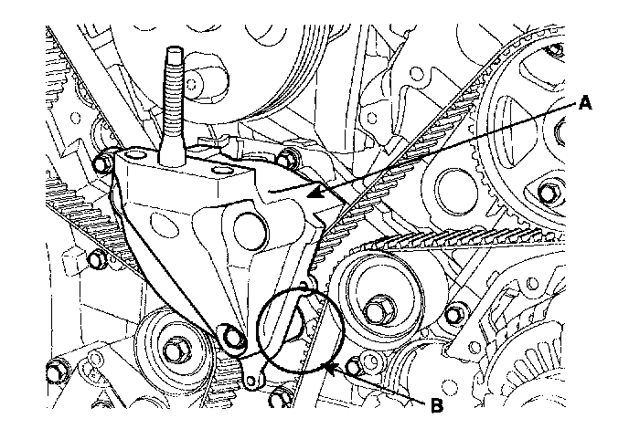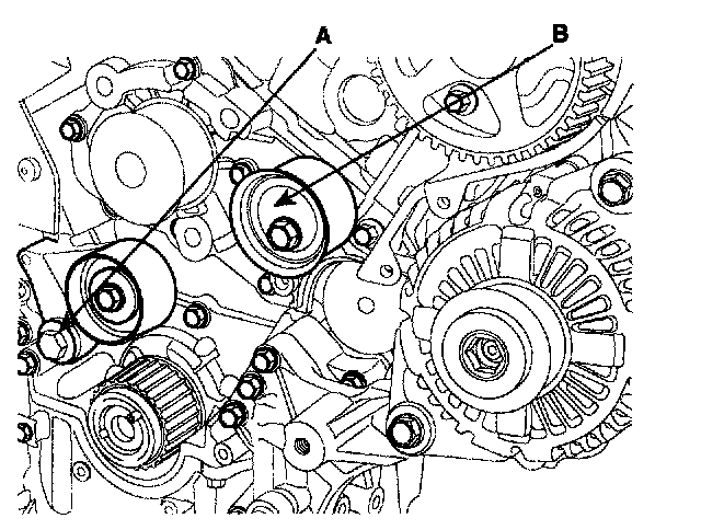2. Install the tensioner arm assembly(A) and the idler(B).