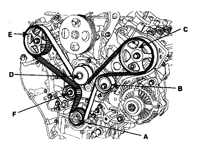 Crankshaft sprocket(A)->Idler(B)->Bank 2 exhaust camsprocket(C)->Water pump pulley(D)->Bank 1 exhaust camsprocket(E)->Tensioner pulley(F).