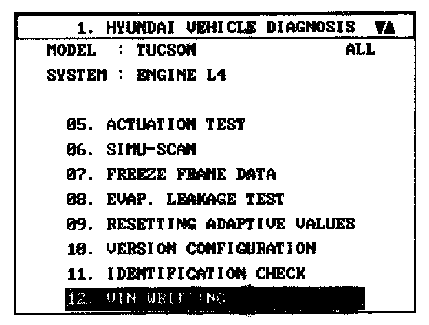 VIN PROGRAMMING PROCEDUREVIN (Vehicle Identification Number) is a number that has the vehicle's information (Maker, Vehicle Type, Vehicle Line/Series, Body Type, Engine Type, Transmission Type, Model Year, Plant Location and so forth. For more information, please refer to the group "GI" in this SERVICE MANUAL). When replacing an PCM, the VIN must be programmed in the PCM. If there is no VIN in PCM memory, the fault code (DTC P0630) is set.