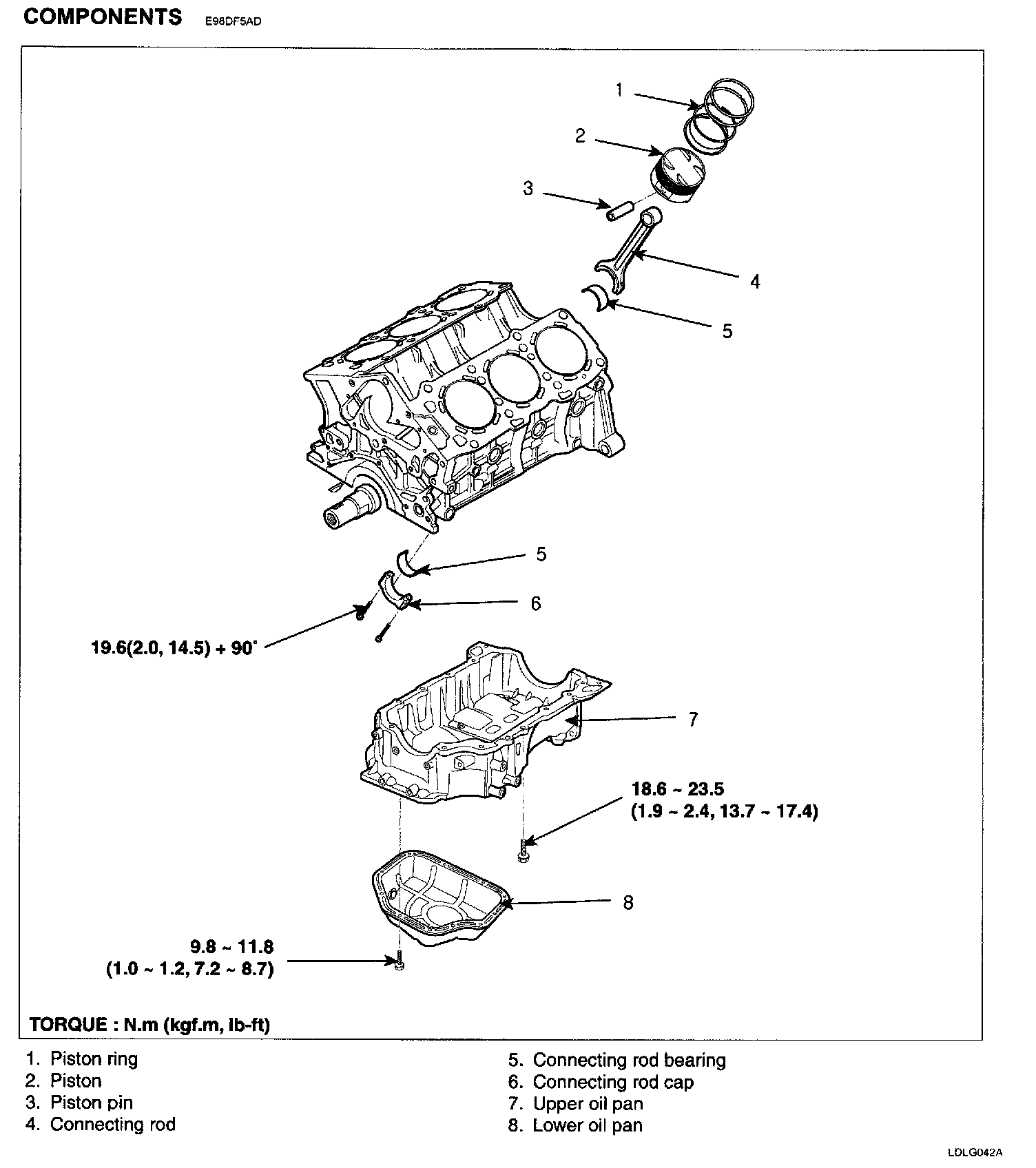 18. Disconnect the connecting rod from the piston. Using a press, remove the piston pin from the piston. (Press-in load: 2451.7-12258.3N(250-1250kg, 551.2-2755.81 lb)