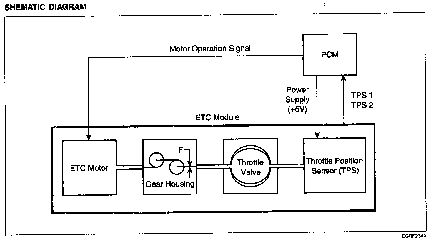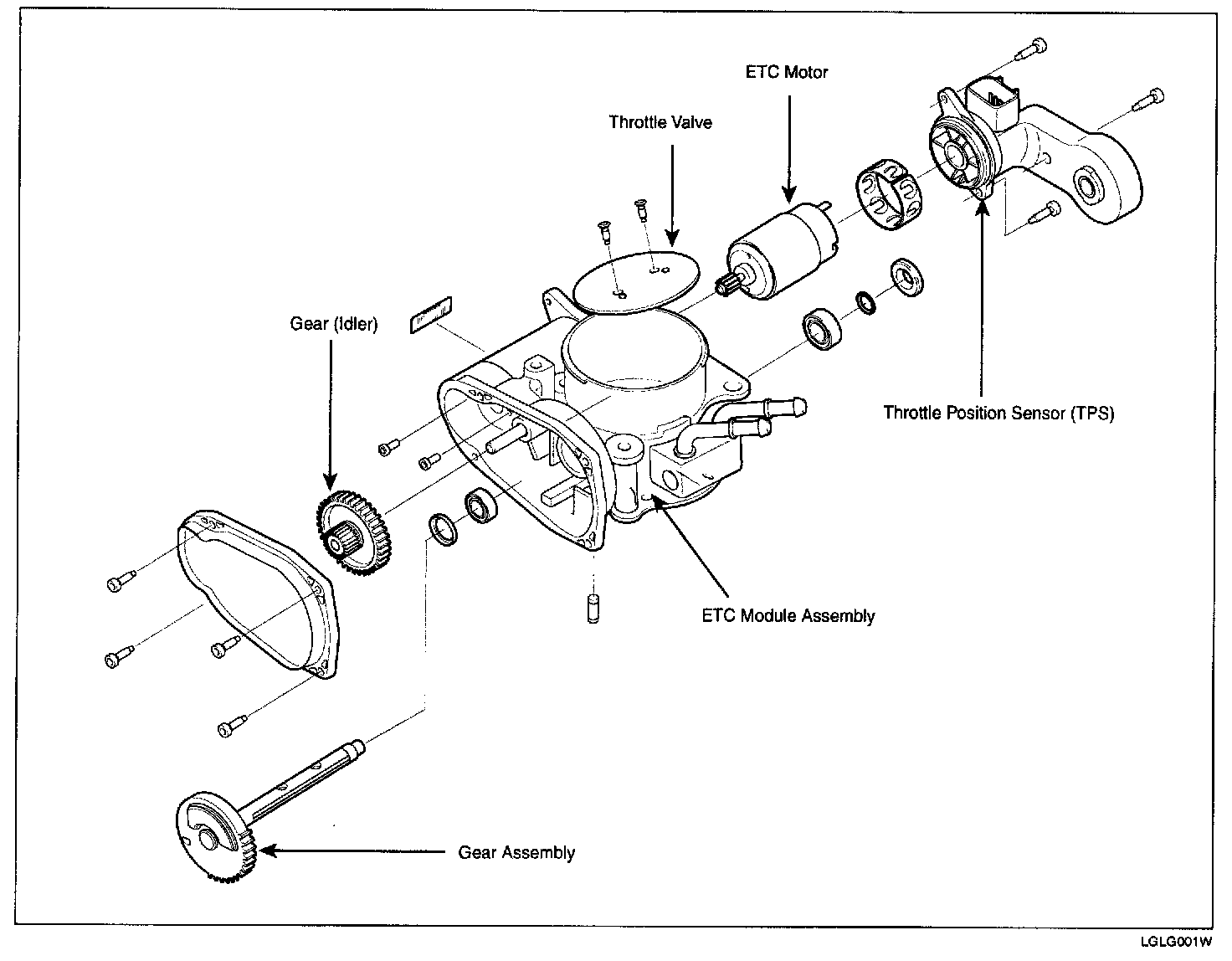 ETC (Electronic Throttle Control) system is electronically controlled throttle device which controls the throttle valve. It consists of ETC motor, throttle body and throttle position sensor (TPS). A mechanical throttle control system receives a driver's intention via a wire cable between the accelerator and the throttle valve, while this ETC system uses the signal from the Accelerator Position Sensor (APS) installed on the accelerator pedal. After the PCM receives the APS signal and calculates the throttle opening angle, it activates the throttle valve by using the ETC motor. Additionally, it can handle cruise control function without any special devices.