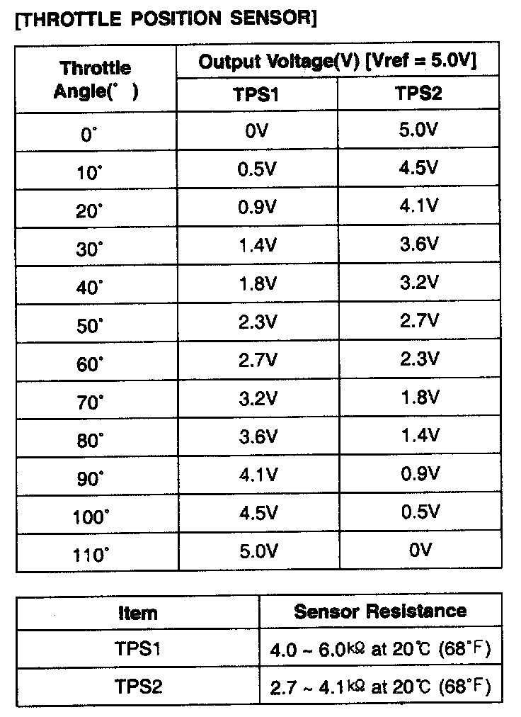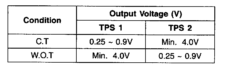 2. Start engine and check output voltages of TPS 1 and 2 at C.T and W.O.T.