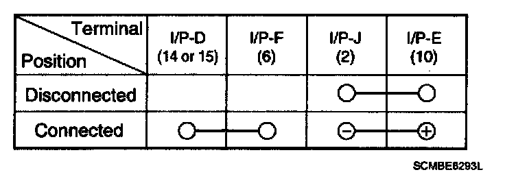 4. There should be continuity between the No. 6 in the I/P-F and No. 14 terminal in the I/P-D when power and ground are connected to the No. 10 terminal in the I/P-E and No. 2 terminal in the I/P-J.