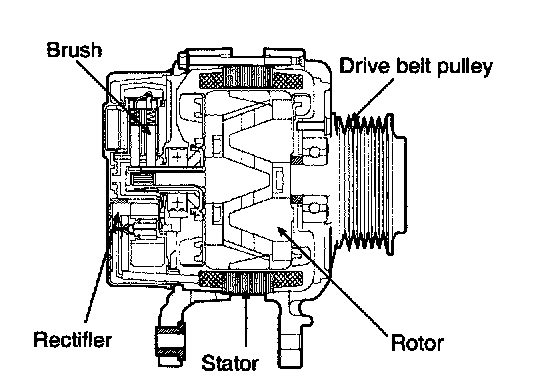 The alternator is regulated by the battery voltage detection system. The main components of the alternator are the rotor, stator, rectifier, capacitor brushes, bearings and V-ribbed belt pulley. The brush holder contains a built-in electronic voltage regulator.