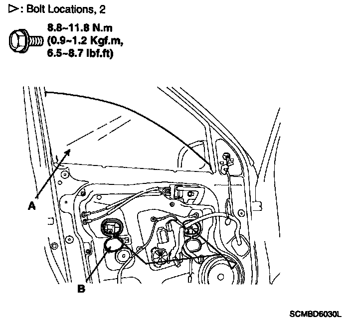 2. Carefully move the glass (A) until you can see the bolts, then loosen them. Separate the glass from the glass run and carefully pull the glass out through the window slot.