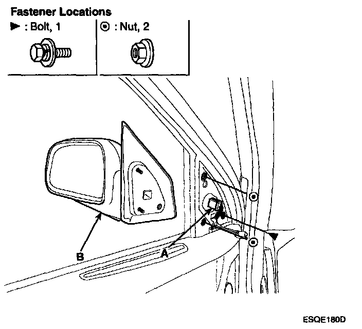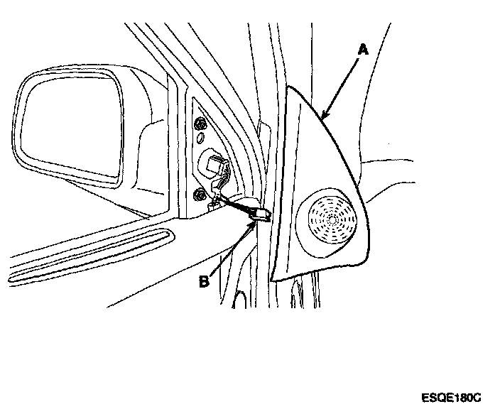2. After disconnecting the connector (A), remove the outside rear view mirror (B).
