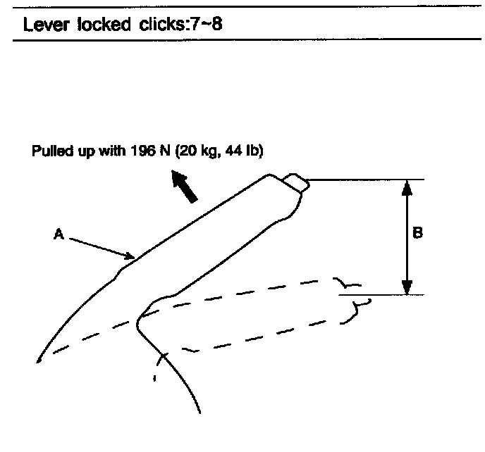 1. Pull the parking brake lever (A) with 196 N (20 kg, 44 lbs.) force to fully apply the parking brake. The parking brake lever should be locked within the specified number of clicks (B).