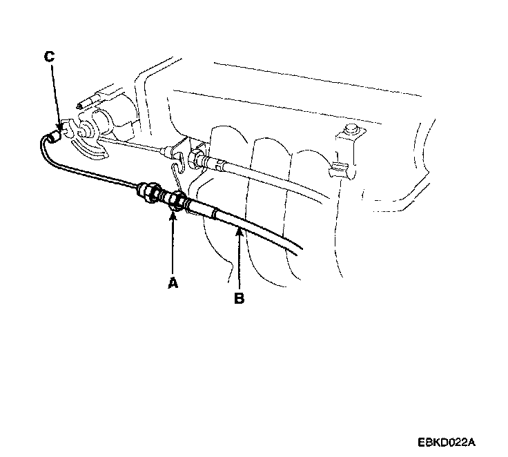 1. Loosen the locknuts(A) and disconnect the actuator cable (B) from the throttle linkage(C).