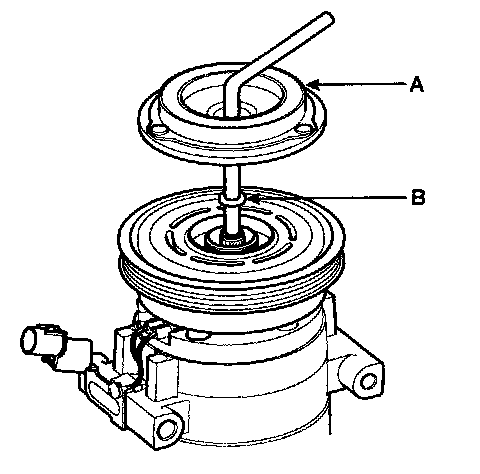 Remove the field coil (A) from the shaft with a puller (B). Be careful not to damage the coil and compressor.