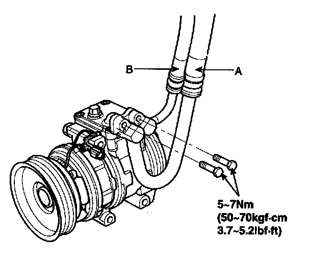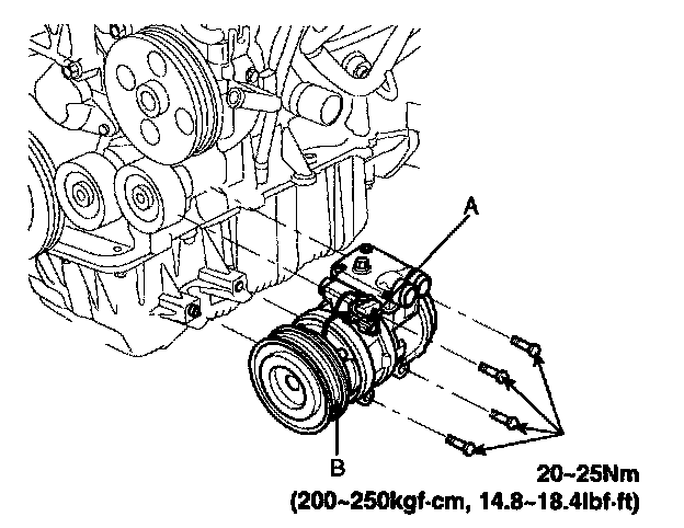 6. Disconnect the compressor clutch connector (A), then remove the mounting bolts and the compressor (B).