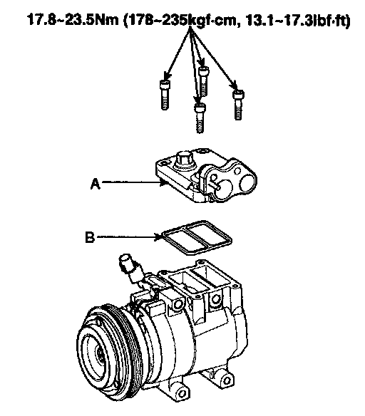 7. Using a hexagon wrench (6 mm) remove the bolts, the manifold assembly (A) and the gasket (B) from the compressor.