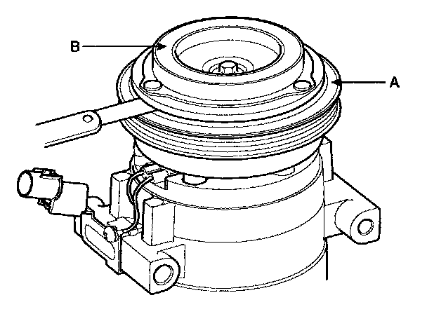 3. Measure the clearance between the pulley (A) and the pressure plate (B) all the way around. If the clearance is not within specified limits. remove the pressure plate and add or remove shims as needed to increase or decrease clearance.