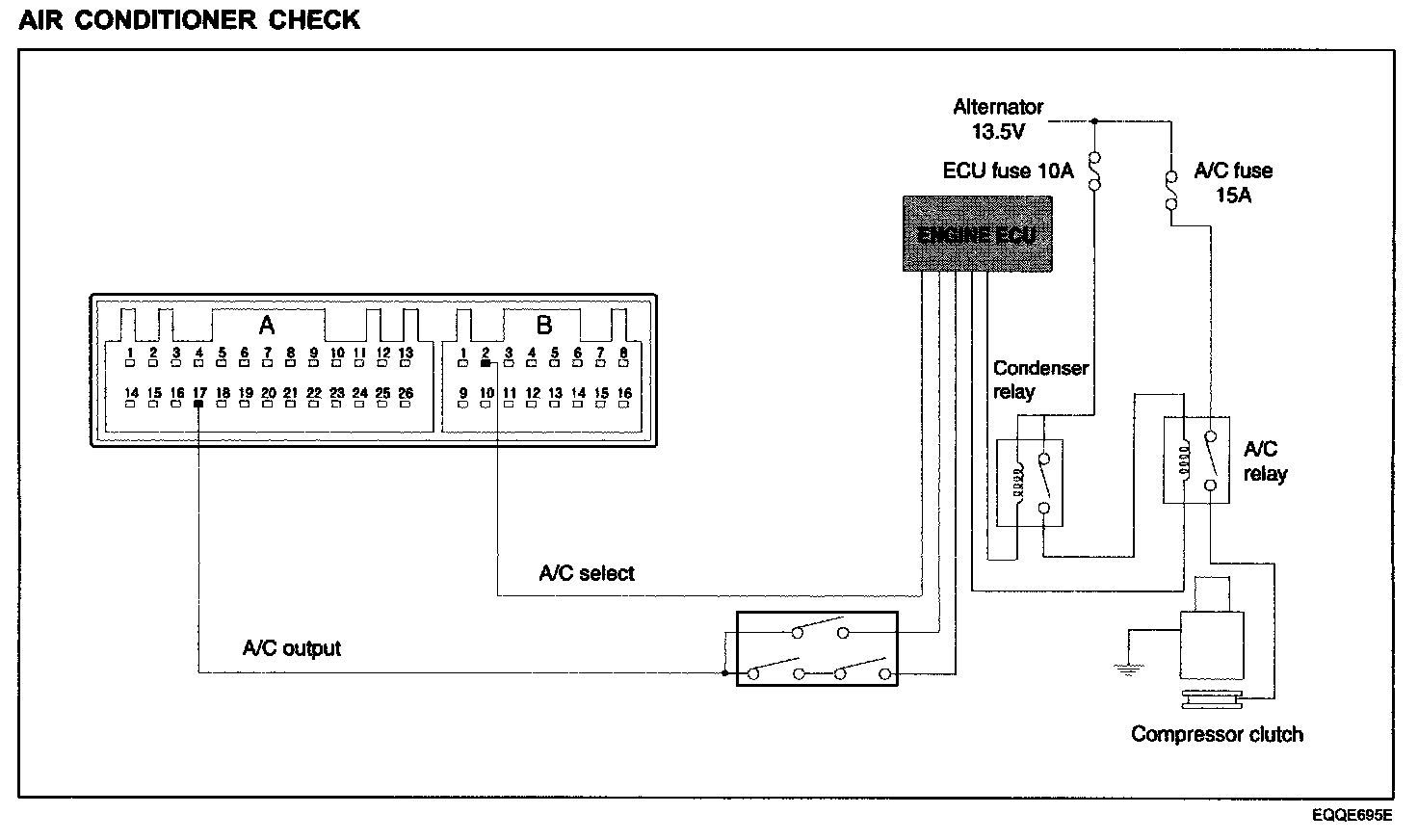 11 V is outputted from connector A17 terminal in turning on INSULATING and pressing air conditioner switch. However, although 11 V is outputted from FATC connector A17 terminal, compressor clutch isn't driven. Wind of air conditioner is discharged if only compressor clutch works. Output signal from air conditioner is inputted in engine computer through triple switch. Then, the engine computer considers several conditions and when output of air conditioner is judged to be practical, it gives GND to signal terminal of air conditioner relay. Accordingly, relay of air conditioner is ON and compressor clutch works. Triple switch checks pressure of refrigerant flowing through pipe and turns on/off switches in it according to standard. So, it controls that output signal of air conditioner outputted from FATC is inputted into engine computer, and also speed of condenser fan according to pressure level. (For high pressure, high-speed and for low pressure, low-speed.)