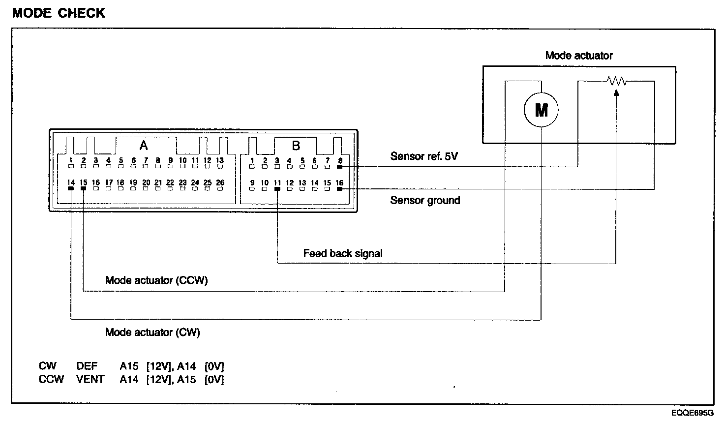In turning on IG and selecting mode switch, sequential operation begins in order of Vent -> Bi-level -> Blower -> Mix. DIP mode works regardless of order at selecting it. As shown in the above figure, in adjusting mode switch from VENT to DEF, 12 V is outputted from connector B4, 0 V is supplied for B5 and mode motor works in direction of DEF. In adjusting mode switch from DEF to VENT, 12 V is outputted from connector B5, 0 V is supplied for B4 and mode motor works in direction of VENT. When mode actuator has to move to a certain location for its automatic control, mode feedback signal terminal moves equally in mode actuator and informs controller of location of mode actuator through mode connector B6. Comparing original value with the inputted value, it works until they are same.