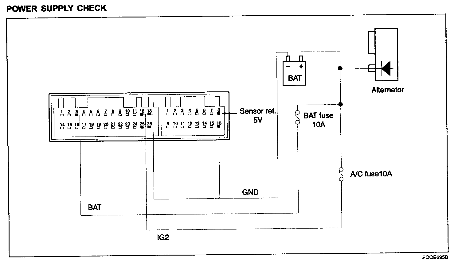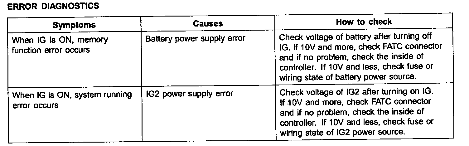 In turning off IGN, battery supplies power for ordinary power, FATC connector A3 through battery fuse. FATC performs memory function by means of battery power supplied as described above. In turning on IGN, alternator is driven. At this time, IG2 power generated in alternator FATC connector A12 and A25 terminal through IG2 fuse and air conditioner fuse 10A. FAT carried out actual system operation by means of IG2 power supplied as described above.