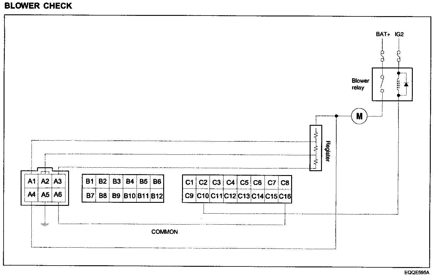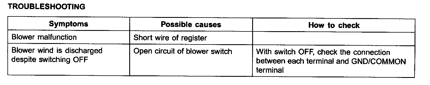 When the blower is turned ON, blower relay becomes turned ON and battery voltage is supplied to the blower motor upper part. The current determined by the supplied battery voltage, blower motor, and register ground runs to GND through the blower motor and the selected blower single resister.