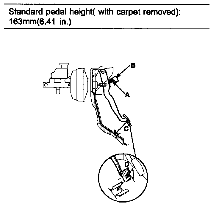 2. Life up the carpet. At the insulator cutout, measure the pedal height (c) from the middle of the left-side center of the pedal pad (D).