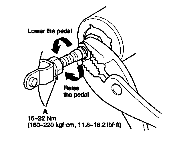 3. Loosen the pushrod locknut (A), and screw the pushrod in or out with pliers until the standard pedal height from the floor is reached. After adjustment, tighten the locknut firmly Do not adjust the pedal height with the pushrod depressed.