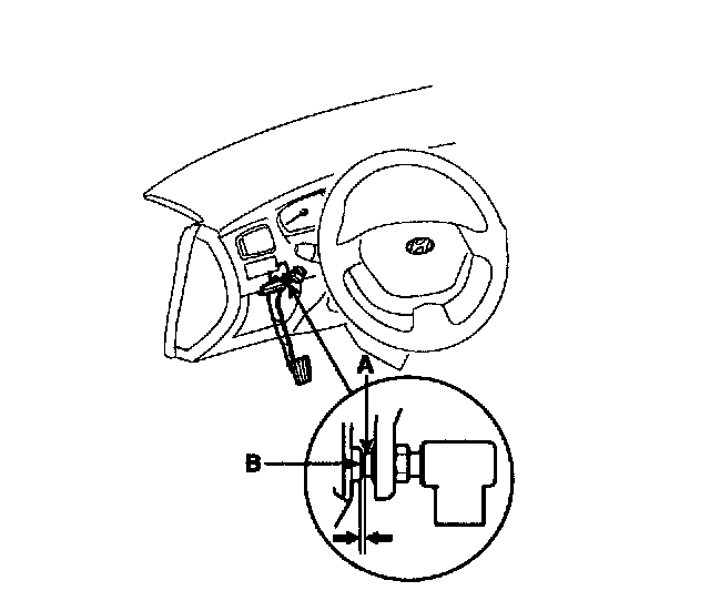 Screw in the brake switch until its plunger is fully depressed (threaded end (A) touching the pad (B) on the pedal arm) then back off the switch 3/4 turn to make 0.5 - 1.0 mm (0.0197 - 0.0394 inch) of clearance between the brake switch connector. Make sure that the brake lights go off when the pedal is released.
