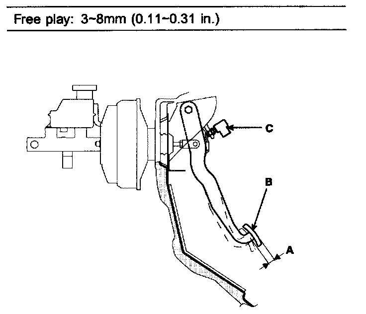 2. If the pedal free play is out of specification, adjust the brake switch (c). If the pedal free play is insufficient, it may result in brake drag.