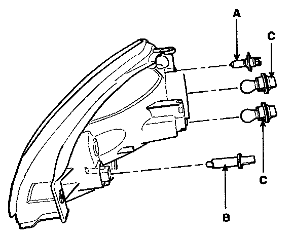3. Replace the head lamp bulb(A), position bulb(B) and turn signal bulbs(C).
