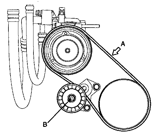 Only BETA ENG. Apply a force of 98 N (10 kgf, 22 lbf), and measure the deflection at the mid point (A) between the air condition compressor and crankshaft pulley.