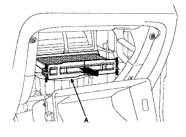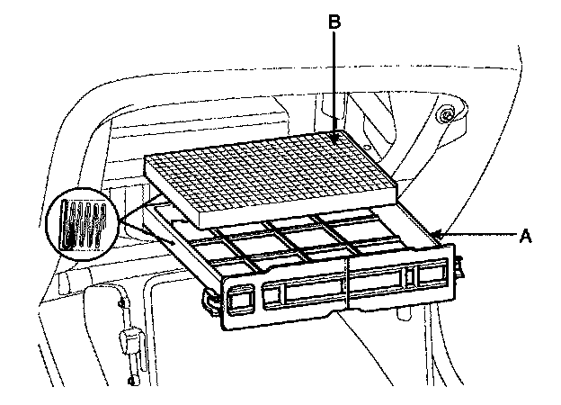 3. Remove the A/C air filter(B) from the filter housing(A). Replace the A/C air filter according to the maintenance schedule in the owner's manual.