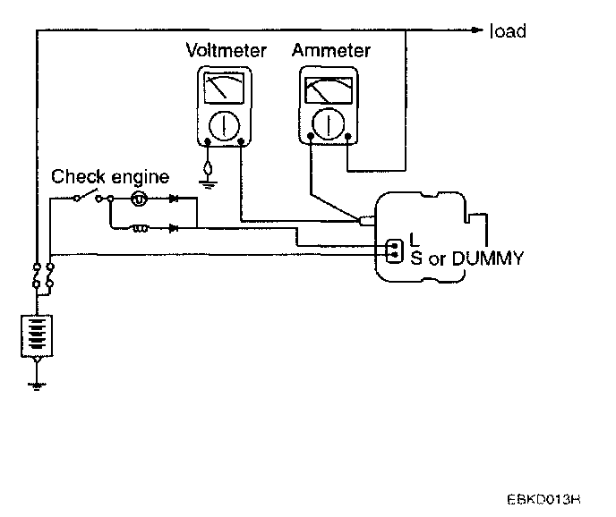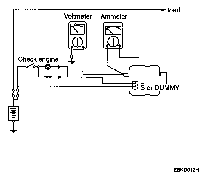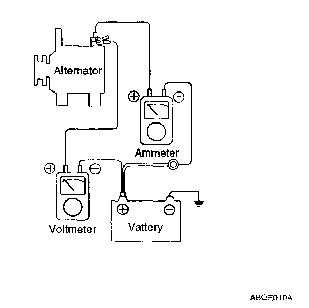 3. Run the engine at a speed of about 2,500 rpm and read the voltmeter when the alternator output current drops to 10 A or less.